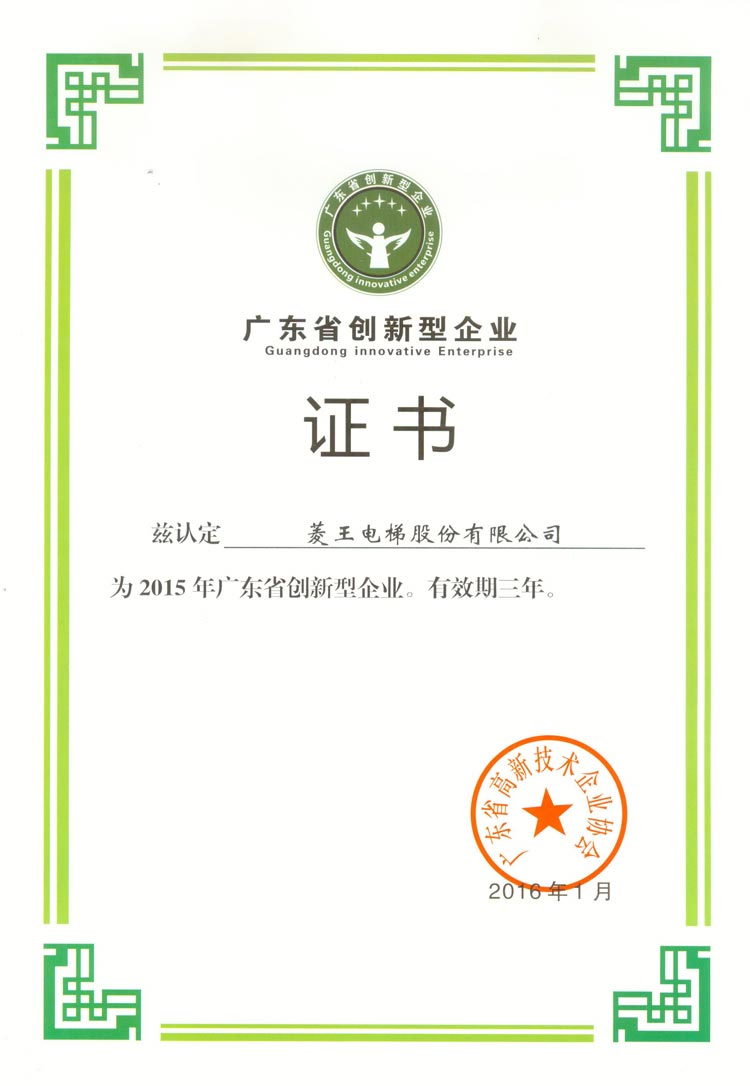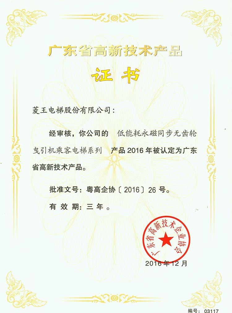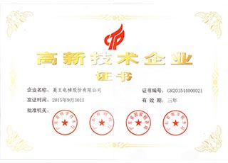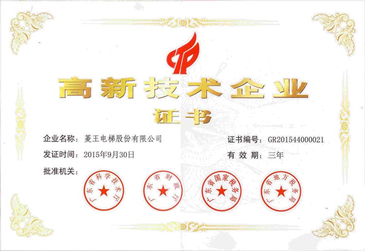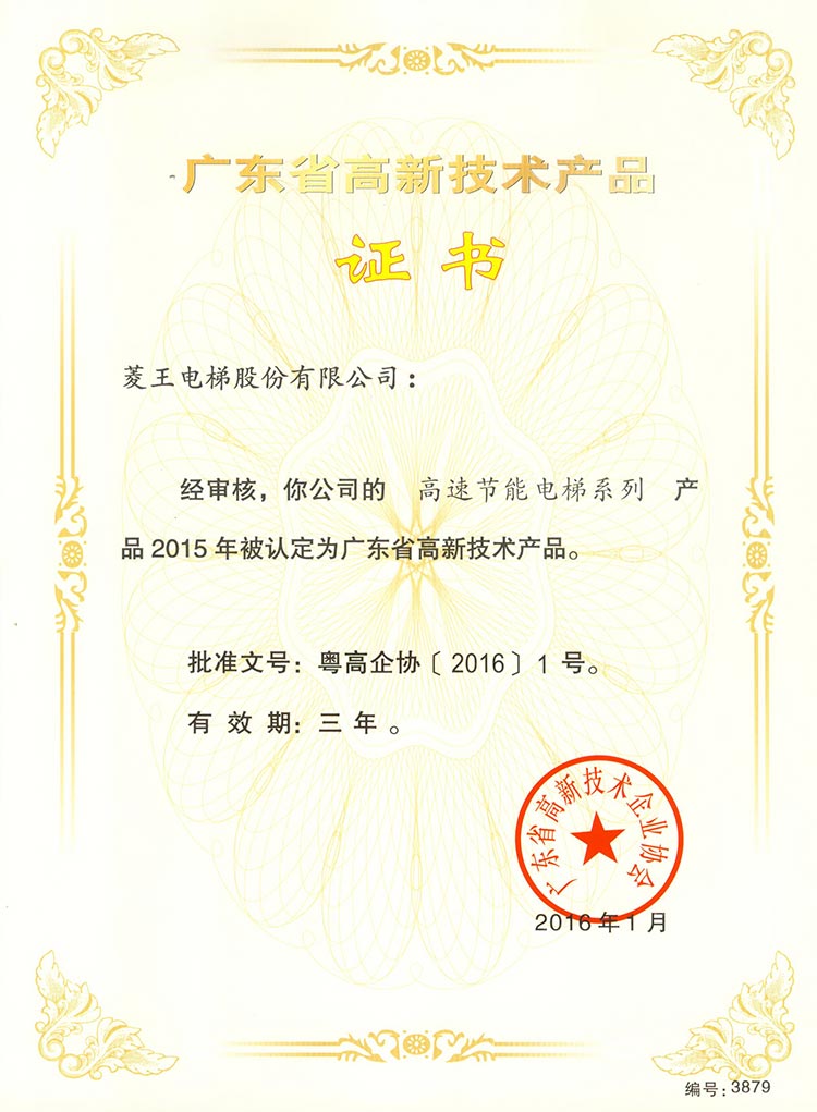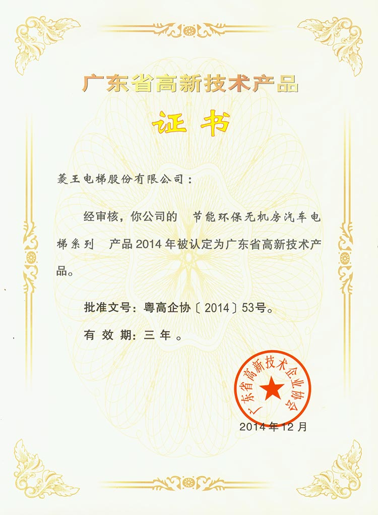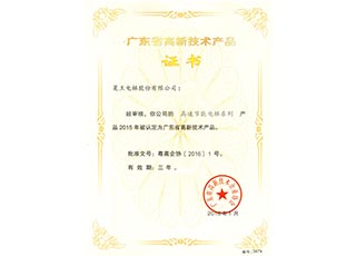High-tech Product Certificate of Guangdong Province (High-speed Energy-saving Elevator Series)