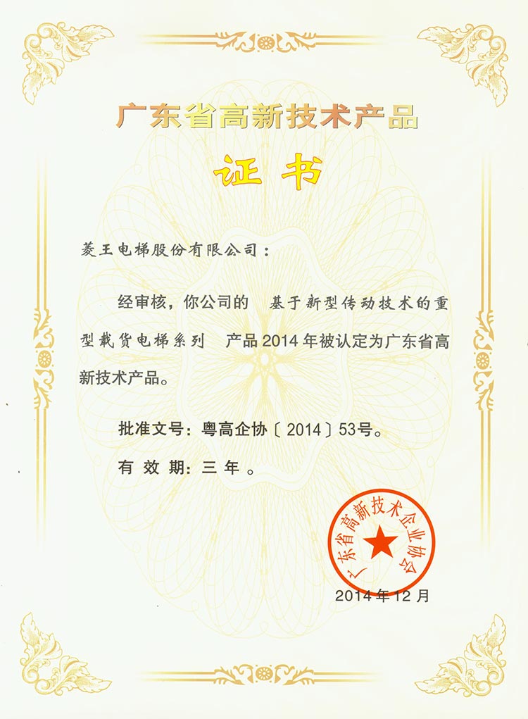 Guangdong High-tech Product Certificate (Heavy Cargo Elevator Series Based on New Transmission Techn