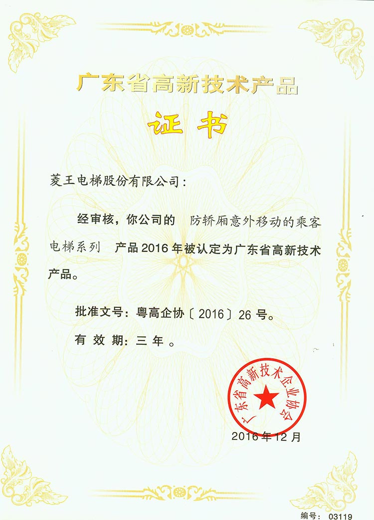 Guangdong Provincial High-tech Product Certificate (Passenger Elevator Series to Prevent Accidental