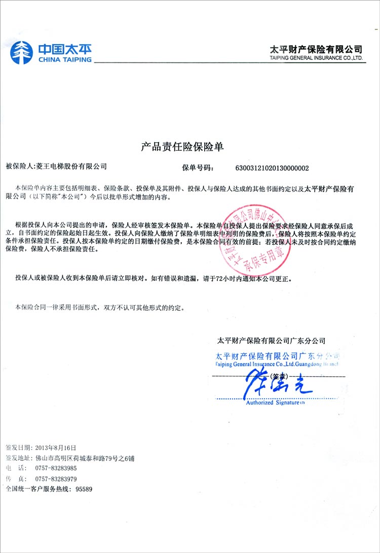 Taiping Property Product Liability Insurance Policy