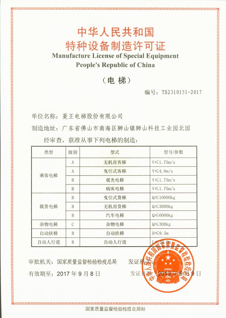 Obtained "1.6T, 4m/s"High Speed Elevator Permit from State Administration of Quality Supervision