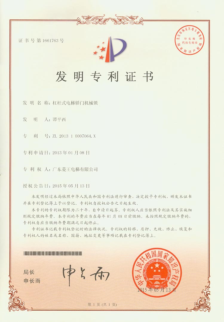Invention patent certificate (mechanical lock of lever elevator car door)