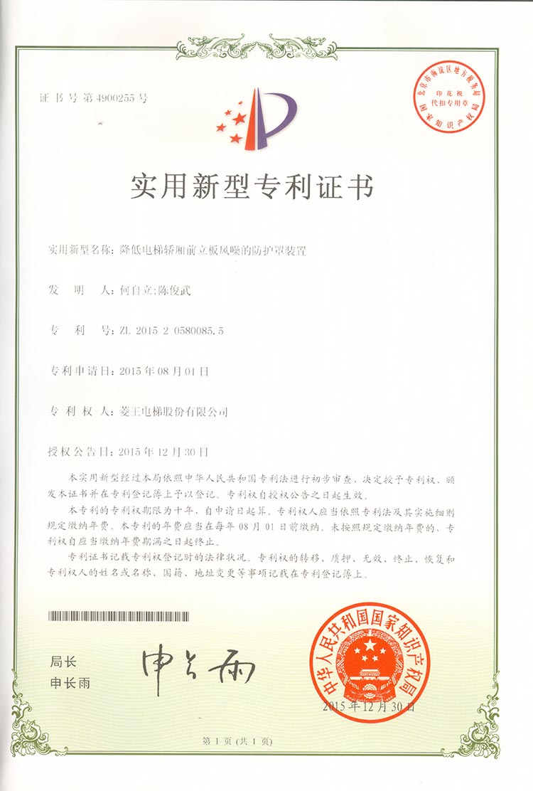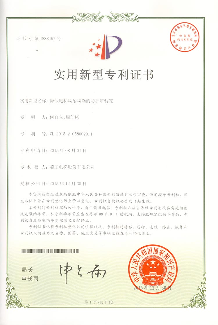 Utility model patent certificate (protective cover device for reducing wind noise of elevator fan)