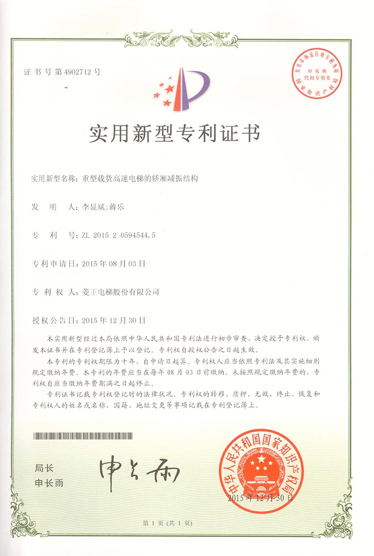 Utility model patent certificate (car vibration reduction structure for heavy-duty high-speed elevat