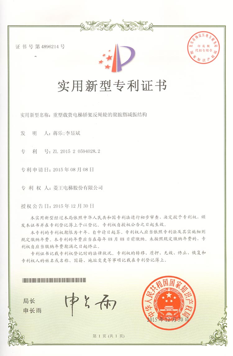 Utility model patent certificate (polyurethane damping structure for heavy-duty cargo elevator tract