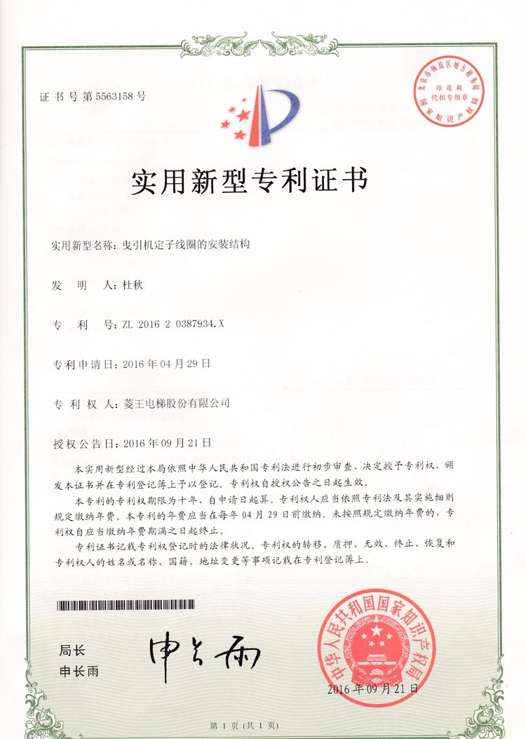 Utility model patent certificate (installation structure of stator coil of traction machine)