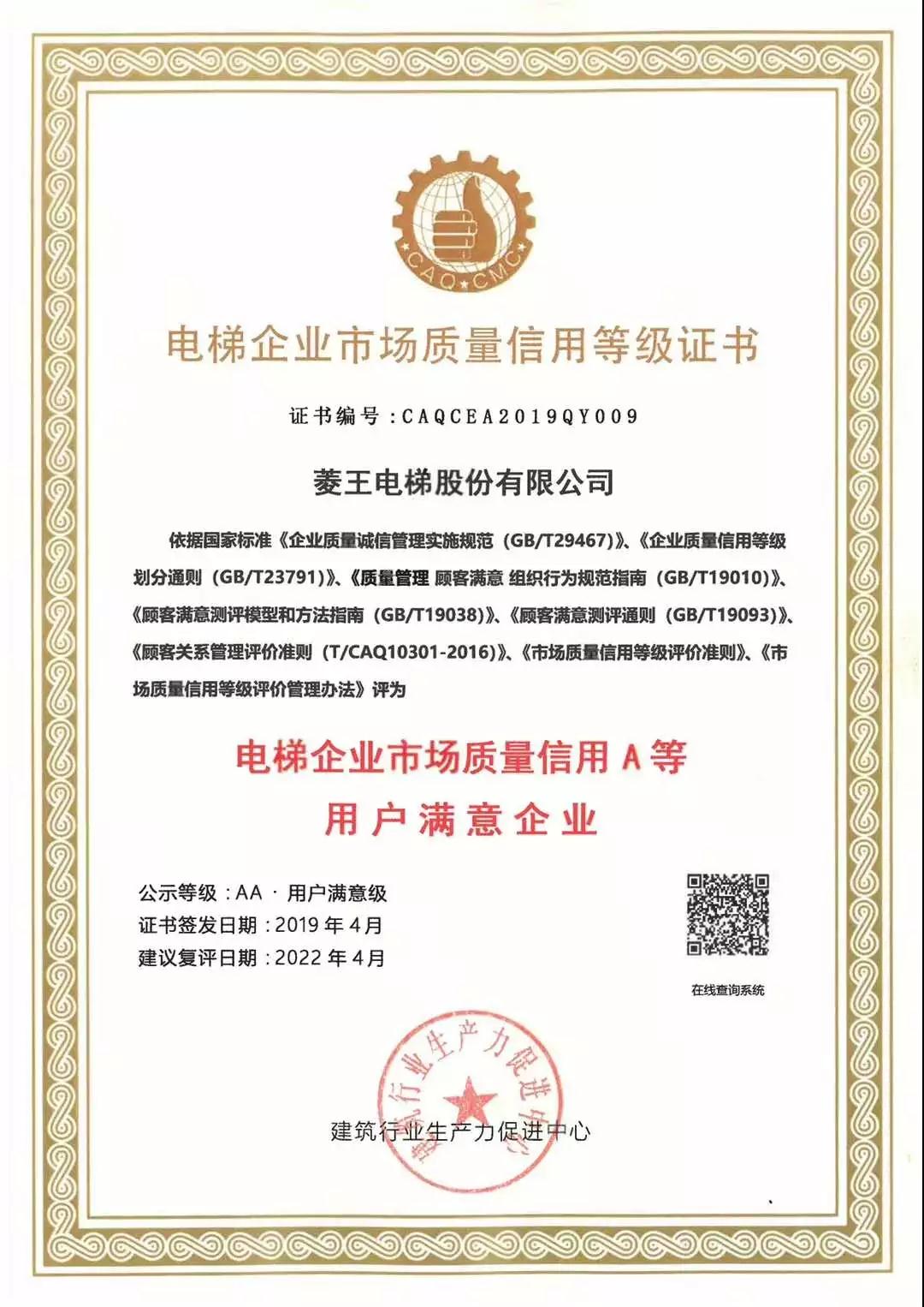 LINVOL Elevator was awarded "Elevator Enterprise Market Quality Credit A and other User Satisfaction Enterprises"